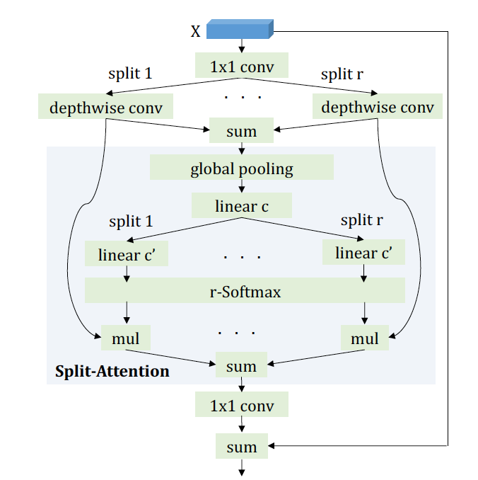 图 2: 含 Split-Attention 注意力模块的 MBConv 模块。