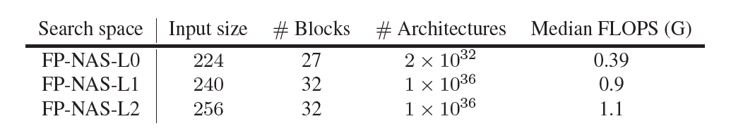 FP-NAS space。为了支持搜索更大的神经架构,我们把 FBNetV2-F++ 的搜索宏架构变得更宽更深,同时提高输入图像的分辨率,得到三个更大的 FP-NAS 搜索空间 L0-L2。