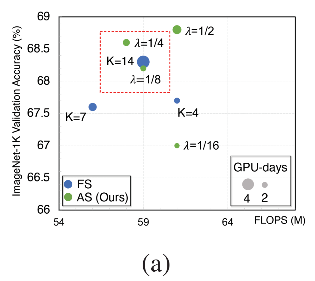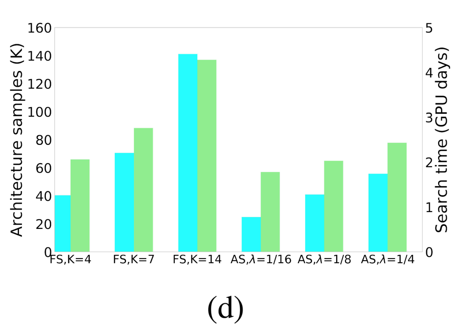 的自适应采样搜索得到的架构已经能达到用Κ=14的固定采样搜索得到的架构相似的 ATC,但是搜索时间大大缩短。在图 3(b)中,我们发现采用