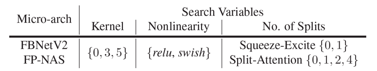表 2: FBNetV2 和 FP-NAS 搜索空间的微架构。
