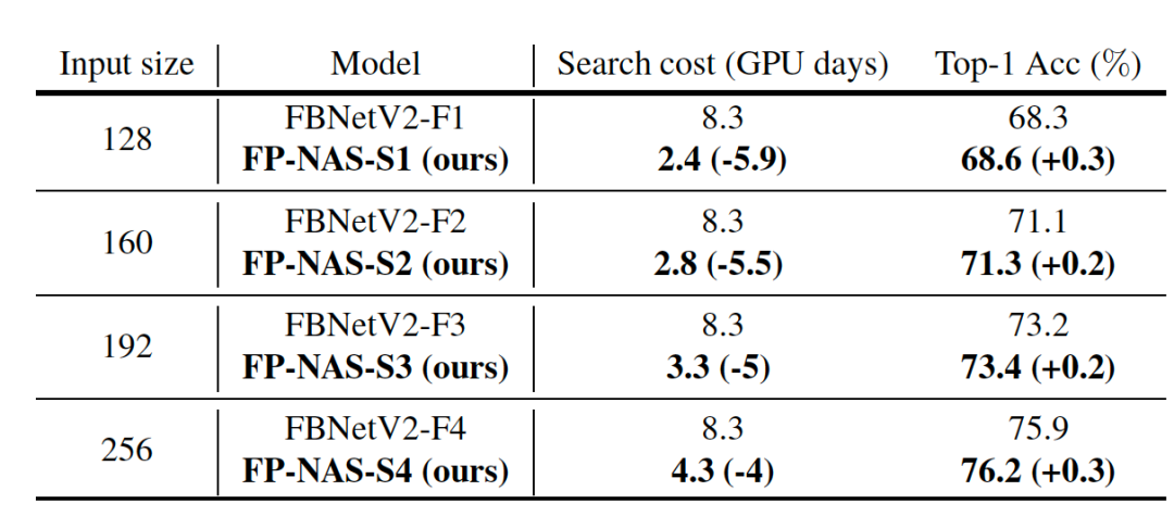 我们使用同样的 FBNetV2-F 搜索空间,比较 FP-NAS 和 FBNetV2 两种不同的搜索方法。在表 6 中,我们发现 FP-NAS 可以加快搜索达 1.9 到 3.6 倍,并且最终得到的架构能达到更高的分类精度。