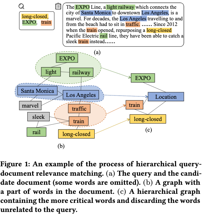 本文大致的思想是在匹配的过程中,大部分的模型没有考虑长距离单词关系和不同粒度的相关信息。所以作者总结了如下的匹配流程:首先根据 query-document 的匹配,建立 word-word 的图,从而建立长距离的单词关系;在此基础上对于每个部分选择中心词,并去除不重要的词,从而考虑不同粒度的相关信息。