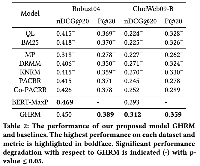 另外,由于文档收集的复杂性和规模,探索不同粒度的层次匹配信号是相当重要的。因此,作者提出了一种基于图的分层相关性匹配模型(GHRM),通过该模型可以同时捕获细微和通用的分层匹配信号。作在两个代表性的 ad-hoc retrieval 数据集验证了 GHRM 的有效性。