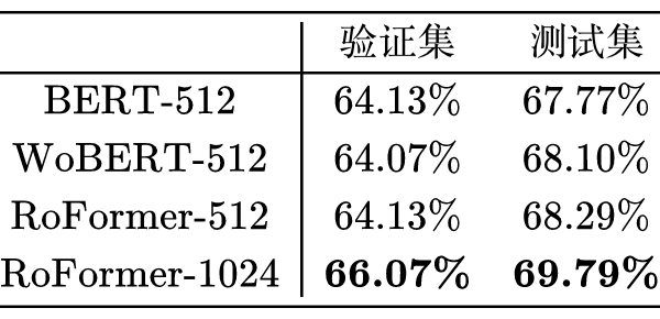 其中 后面的参数是微调时截断的 maxlen,可以看到 RoFormer 确实能较好地处理长文本语义,至于设备要求,在 24G 显存的卡上跑 maxlen=1024,batch_size 可以跑到 8 以上。目前中文任务中笔者也就找到这个任务比较适合作为长文本能力的测试,所以长文本方面只测了这个任务,欢迎读者进行测试或推荐其他评测任务。