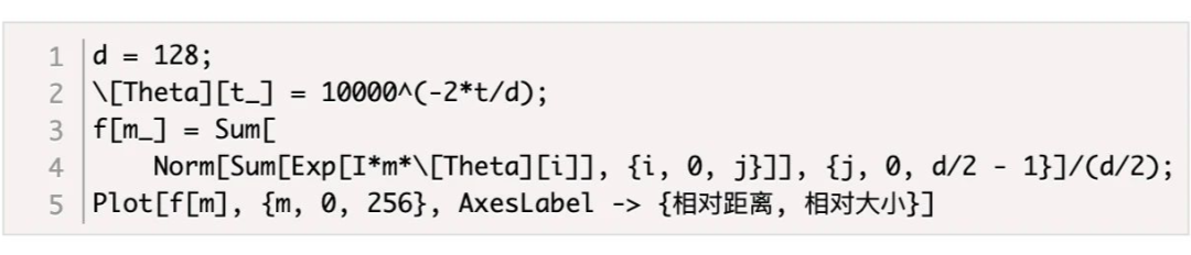 从图中我们可以可以看到随着相对距离的变大,内积结果有衰减趋势的出现。因此,选择 ,确实能带来一定的远程衰减性。当然,同上一篇文章说的一样,能带来远程衰减性的不止这个选择,几乎任意的光滑单调函数都可以,这里只是沿用了已有的选择而已。