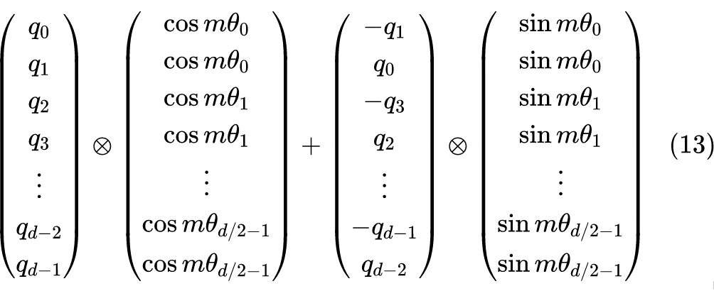 其中 是逐位对应相乘,即 Numpy、Tensorflow 等计算框架中的*运算。从这个实现也可以看到,RoPE 可以视为是乘性位置编码的变体。