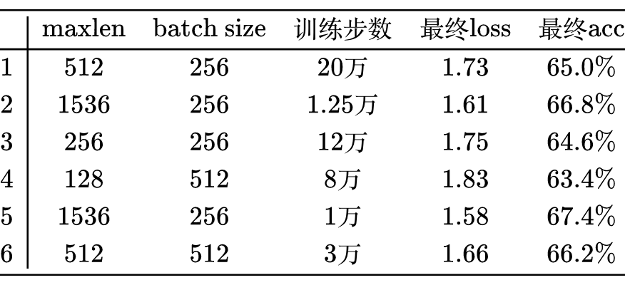 在预训练上,我们以 WoBERT Plus 为基础,采用了多个长度和 batch size 交替训练的方式,让模型能提前适应不同的训练场景: