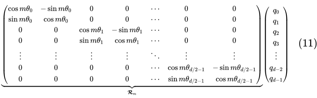 根据复数乘法的几何意义,该变换实际上对应着向量的旋转,所以我们称之为“旋转式位置编码”,它还可以写成矩阵形式: