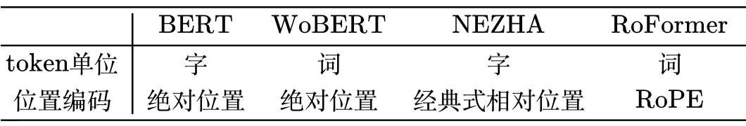 简单来说,RoFormer 是一个绝对位置编码替换为 RoPE 的 WoBERT [1] 模型,它跟其他模型的结构对比如下: