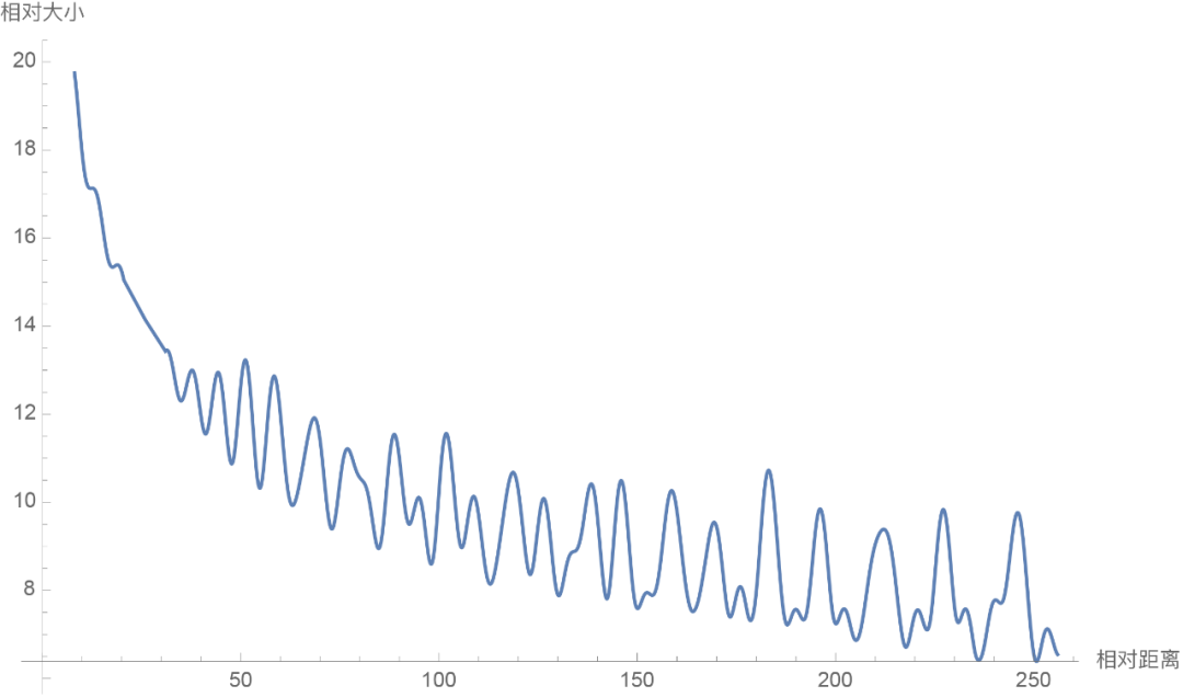 因此我们可以考察 随着相对距离的变化情况来作为衰减性的体现, Mathematica 代码如下: