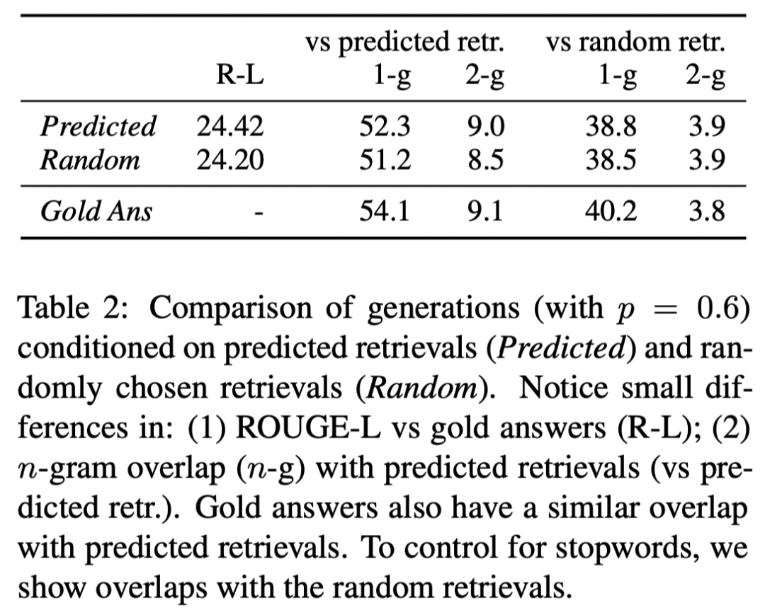虽然本文的 retrieval-augmented 系统实现了 SOTA,但作者发现该系统几乎没有使用检索到的文档。为了测量这一点,作者进行了消融实验,在 inference 时,用维基百科上随机取样的段落替换检索到的段落。之后将这个随机 baseline 与原始系统进行比较,包括生成质量以及生成与检索段落之间的 n-gram 重叠。