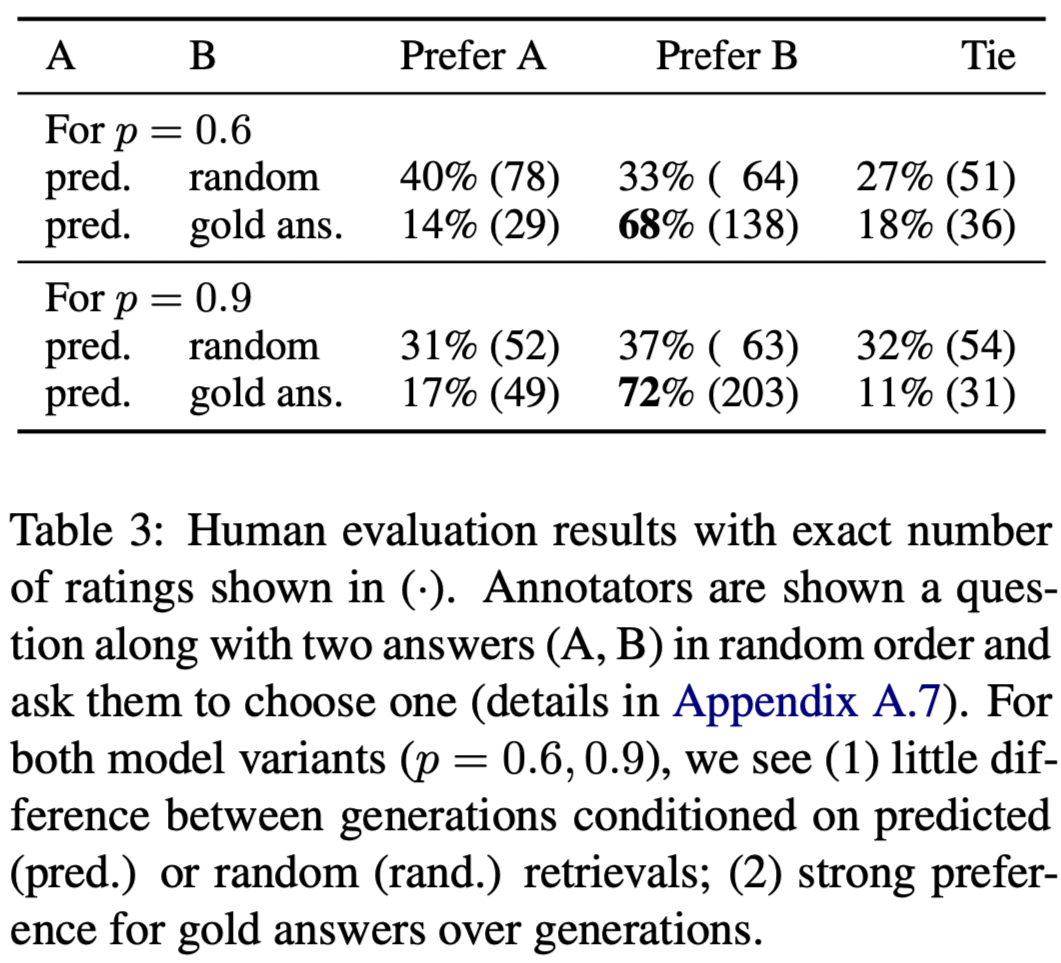 作者做了一个有趣的实验:将 retriver 检索到的文档在 inference 阶段替换为随机采样的文档。人工 A/B 测试和 ROUGE-L 等自动指标的结果表明,对替换为随机文档的操作对生成的答案质量几乎没有影响。