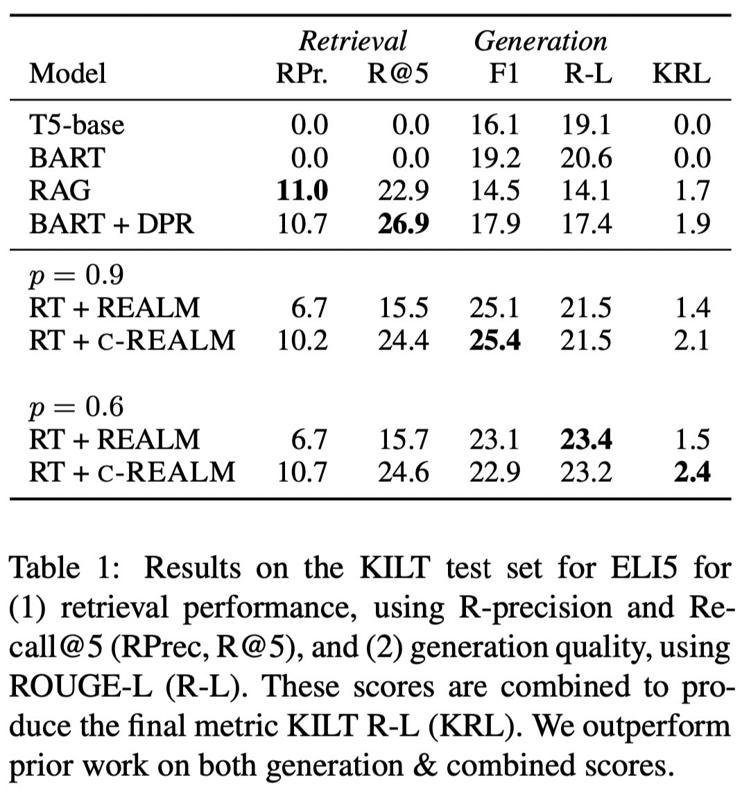 基于“C-REALM”召回的文档,作者使用了“Routing Transformer”(RT,目前长文本语言模型 SOTA)),RT 是一种稀疏注意力模型,利用局部注意和在 mini-batch 中使用 k-means 聚类来更好地建模长期依赖关系。