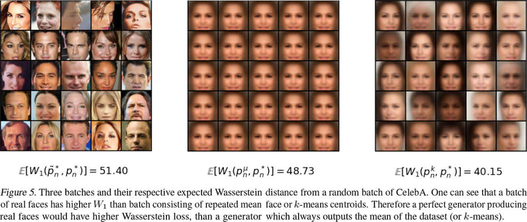 ▲ 左:真实样本batch,中:平均样本,右:样本聚类中心。看Wasserstein距离的话,真实样本还不如后面两个模糊样本