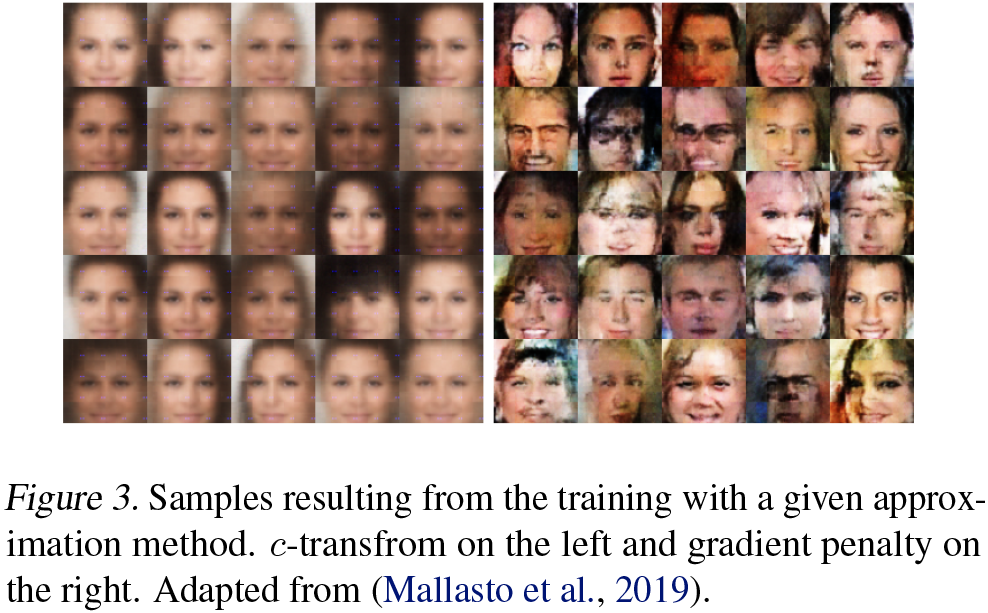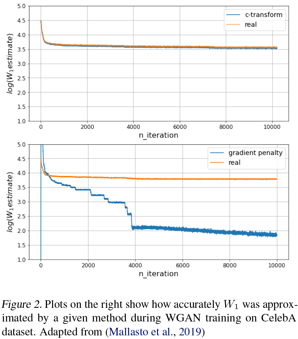首先,论文比较了梯度惩罚(GP)与一种称为 的方法在实现WGAN时的效果。 同样提出自论文《How Well Do WGANs Estimate the Wasserstein Metric?》[6] ,它相比梯度惩罚能更好地近似 Wasserstein 距离。下面两个图也表明了这一点: