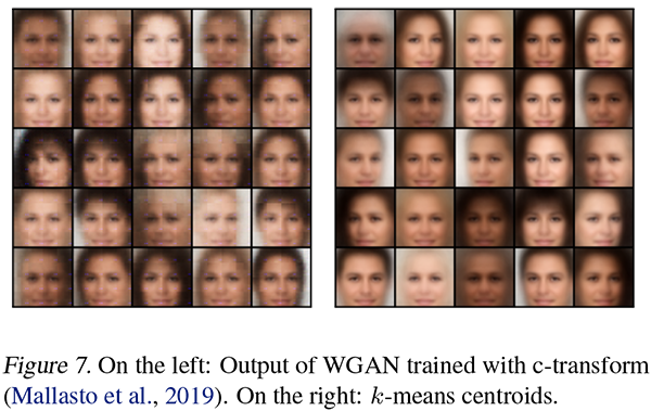 所以如果很精确地去近似 Wasserstein 距离,反而会带来视觉效果上的变差。原论文也做了实验,通过 对 Wasserstein 距离做更好的近似,那么模型的生成效果其实跟 K-Means 聚类中心是类似的,而 K-Means 也正是使用了欧式距离作为度量: