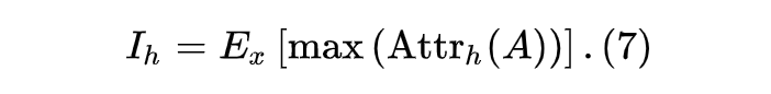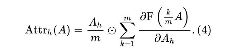 其中 为点乘, 表示第 个注意力头的注意力权重矩阵(同式(1)), 代表线性插值的权重,当其值为 0 时代表所有 token 间的 attention 权重为 0。这样一来,计算结果既考虑了 attention 权重,同时也包含了输出对这一层 attention 权重的敏感程度。