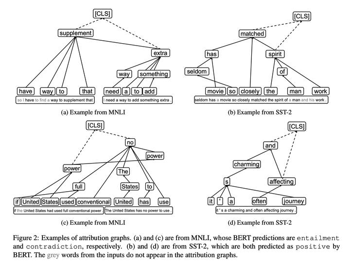 概括一下,就是从最后一层注意力归因出发,在每层找到权重较大的边(通过阈值 τ 进行过滤,并去除已有的边和与已有边反向的边),最终合并各层的边形成完整的图。看看效果图吧: