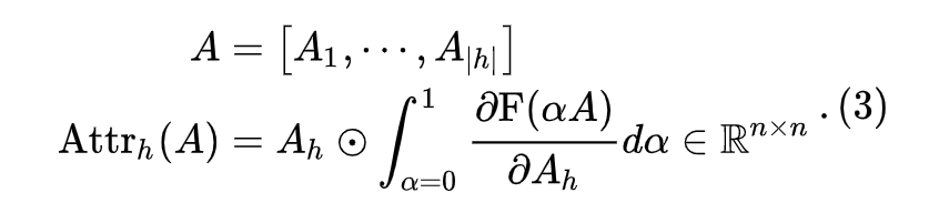 3. 由于 attention score 被证明无法提供输入的重要性解释,采用了积分梯度这一显著性方法,它克服了简单梯度的饱和(saturation)现象,能够很好地反映输入(即 attention)对输出的影响程度而不受其值影响,这一点作为归因图的边权重。