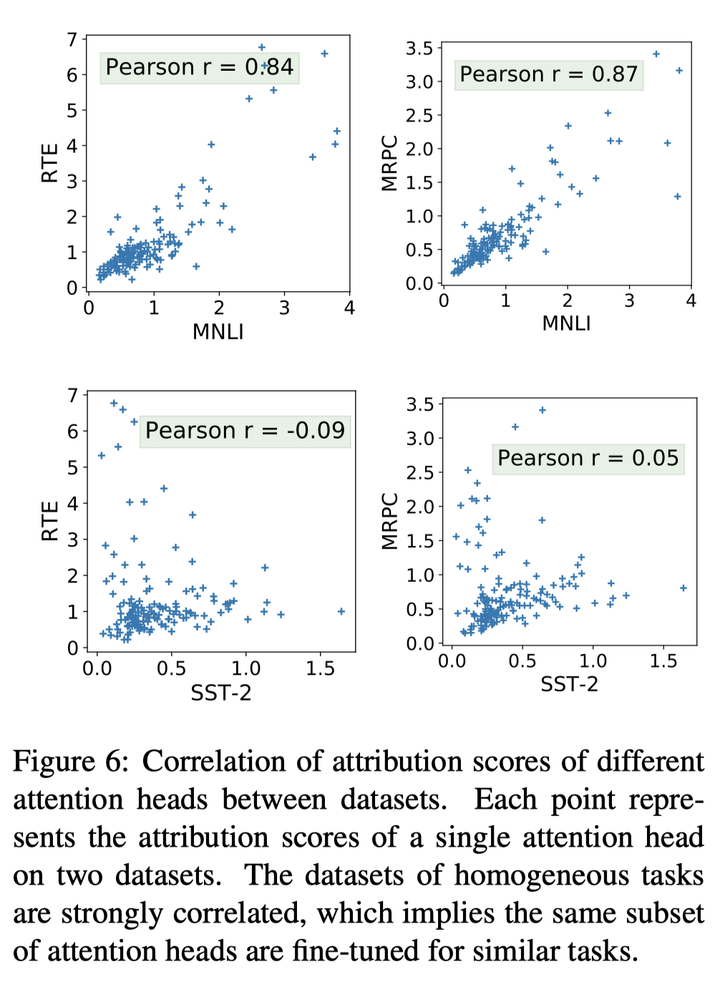 那么,对于不同任务和数据集(或者说领域 domain),这种重要性是否一致?本文也进行了相关性分析,从下图中可以看到,RTE、MRPC 和 MNLI 都具有很大的相关性,RTE、MRPC 和 SST-2 相关性很低,而 RTE、MRPC 和 MNLI 都是 2 句分类的任务,区别在于一个和 MNLI 是同领域,一个不同,而 SST-2 是单句分类任务。