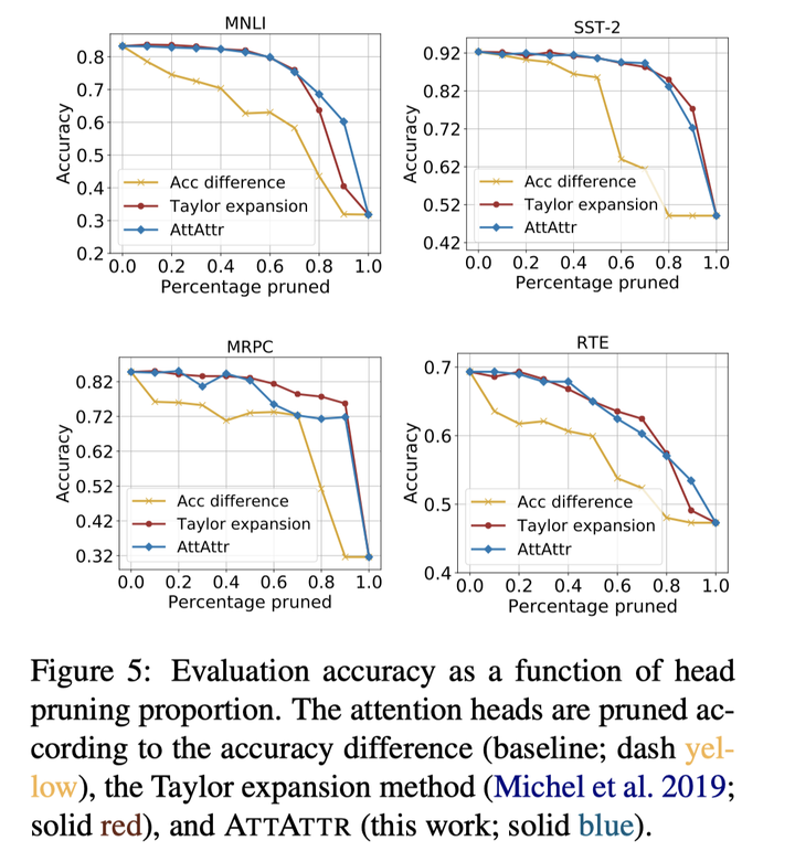 这里,作为参考进行比较的还有基于精确度差(accuracy difference)和泰勒展开(Taylor Expansion)作为重要性的剪枝方法(参考:2019,arxiv,《Are sixteen heads really better than one?》)。