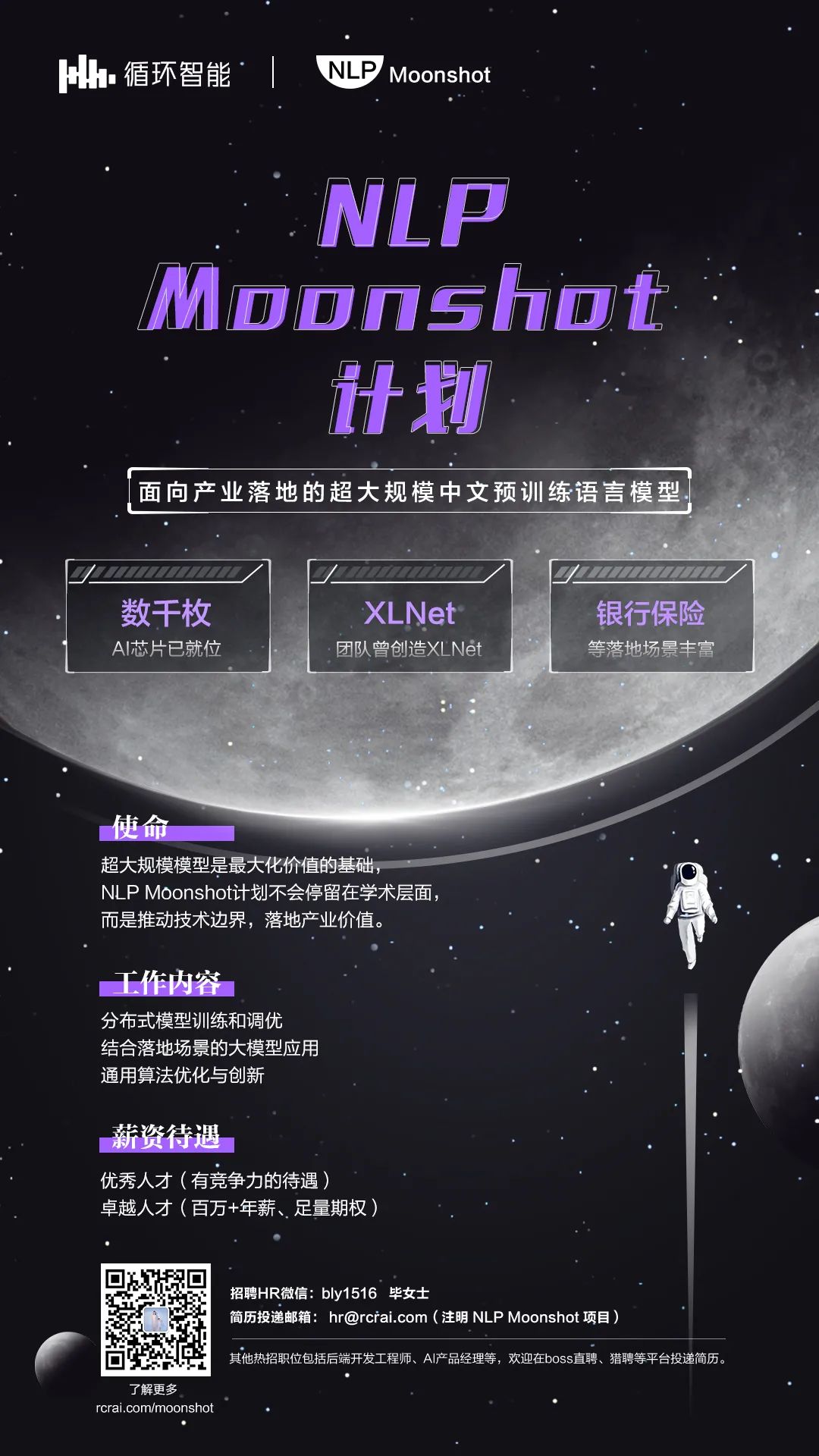 目前循环智能的 NLP Moonshot 小组仍需要新成员加入,如果你对大规模预训练模型非常感兴趣,曾经在 AI 顶会发表过论文或者正在从事相关的前沿研究,具备十足的创新能力,欢迎你的加入。