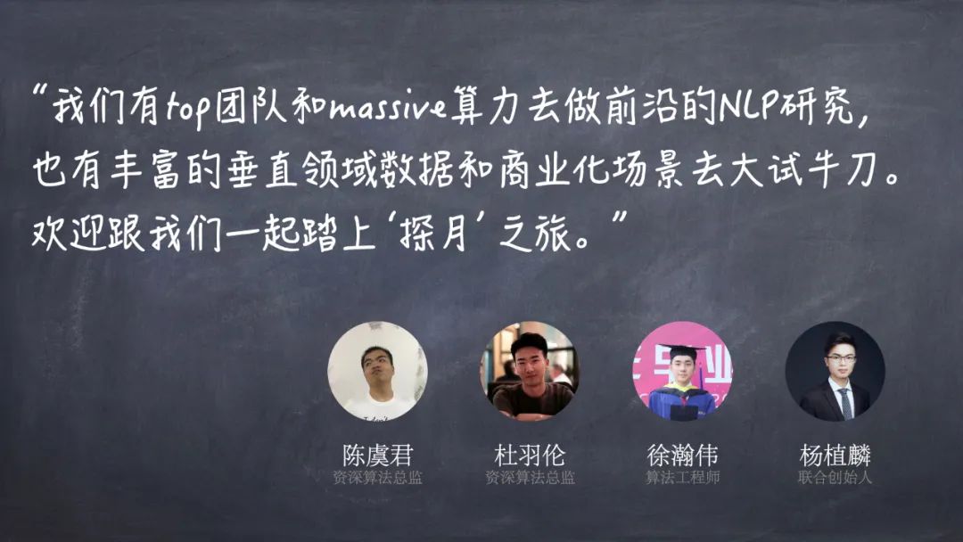 循环智能资深算法总监陈虞君、资深算法总监杜羽伦和算法工程师徐瀚伟表示,“我们有top团队和massive算力去做前沿的NLP研究,也有丰富的垂直领域数据和商业化场景去大试牛刀。欢迎跟我们一起踏上‘探月’之旅。”