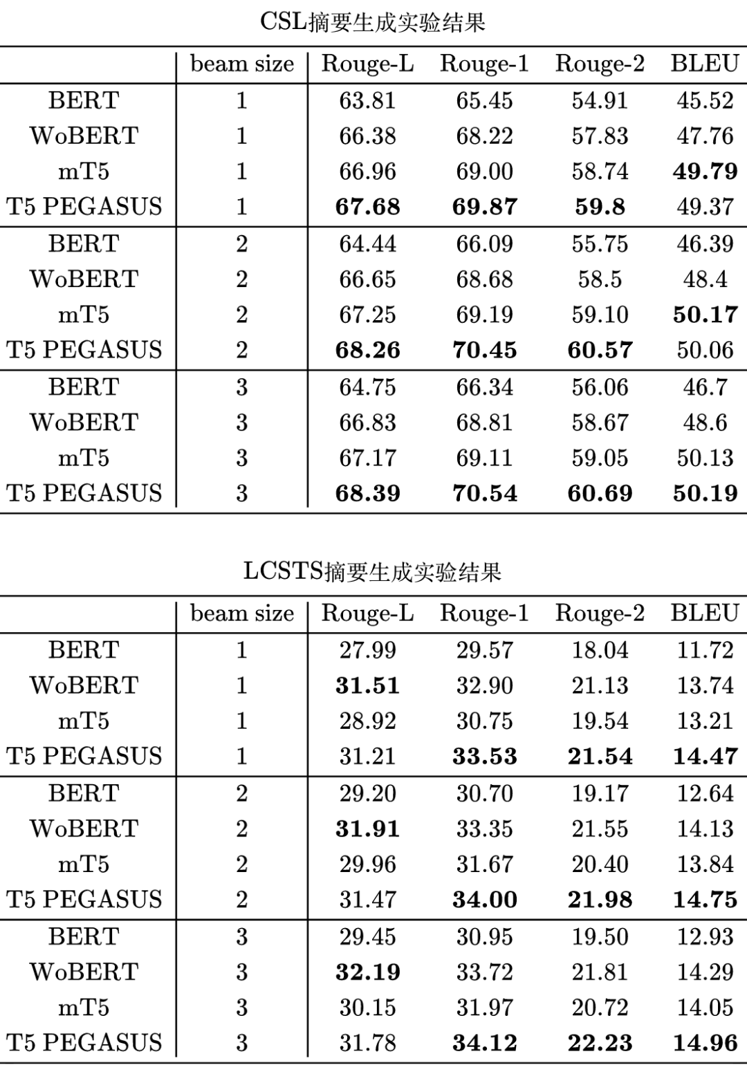 在 CSL 和 LCSTS 两个文本生成任务上,T5 PEGASUS 是我们已知的所有模型中的 SOTA:
