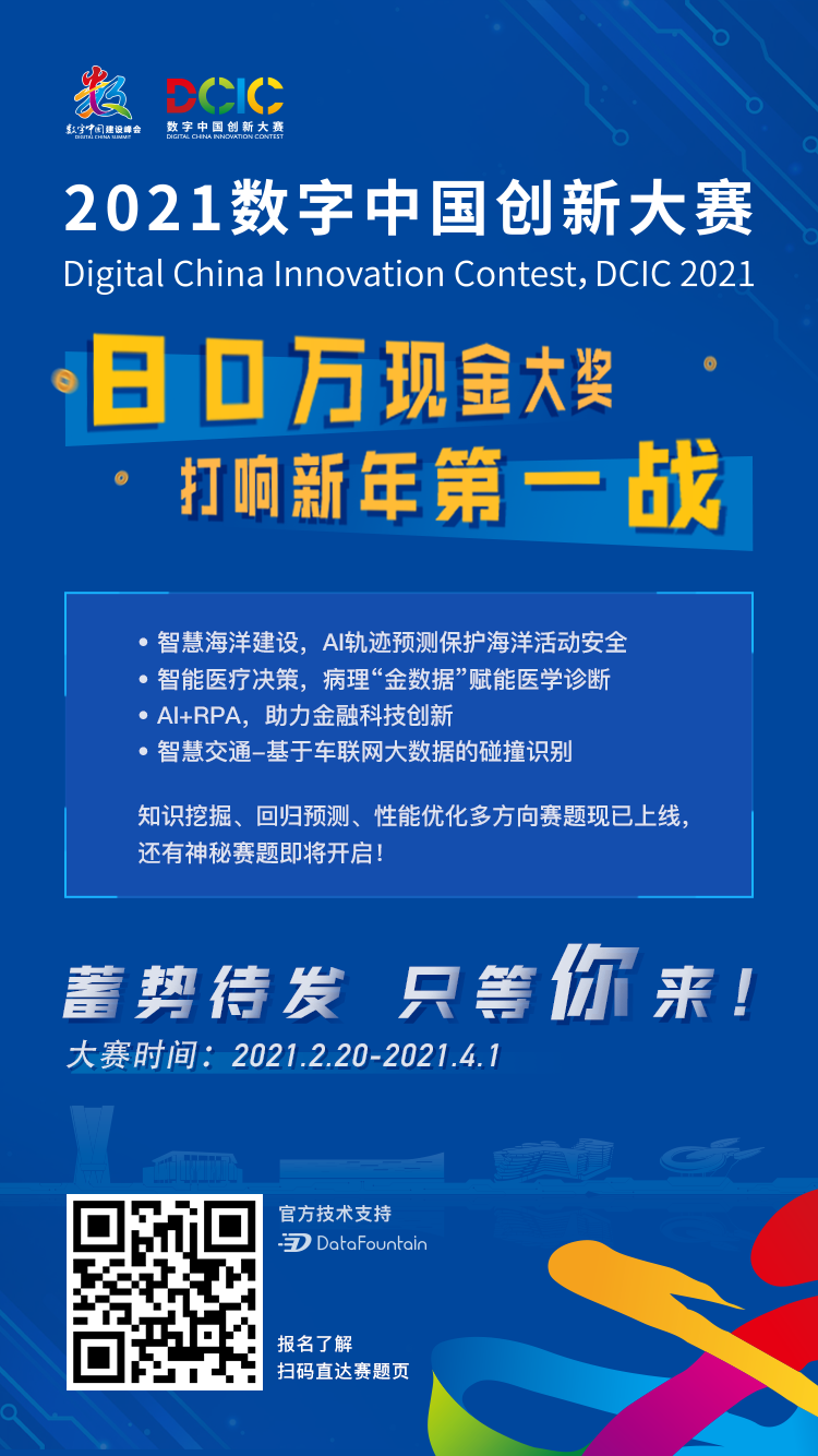 继2020年百万奖金的NAIC“鹏城赛”、万人参与的CCF BDCI赛后,DataFountain平台已发布2021年第一场赛事 "数字中国创新大赛" ,它已经向你走来~