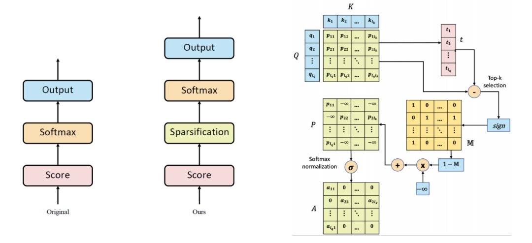 模型图如上图,最左边是标准计算注意力的路线,中间的是 Sparse 的实现,可以看到区别就在于中间多了一个手工选择的 Sparsification,最右则是它的执行示意图。简单来说就是在算 softmax 分数之前先进行 top-k 选择出少数的重要元素即可。具体来说先算内积: