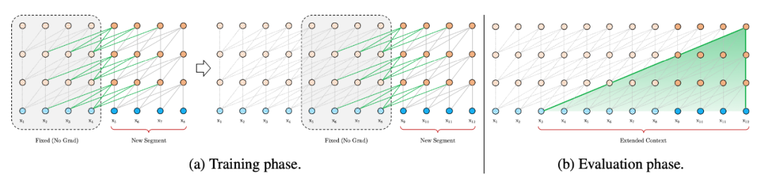 segment-level 循环机制。如上图左边为原始 Transformer,右边为 Transformer-XL,Transformer-XL 模型的计算当中加入绿色连线,使得当层的输入取决于本序列和上一个序列前一层的输出。这样每个序列计算后的隐状态会参与到下一个序列的计算当中,使得模型能够学习到跨序列的语义联系(看动图可能更好理解)。
