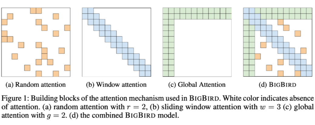 也是采用稀疏注意力机制,将复杂度下降到线性,即 O(N)。如上图,big bird 主要包括三个部分的注意力:
