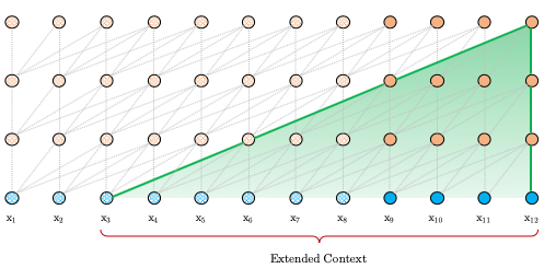 即每一个位置的隐向量,除了自己的位置,都跟下一层中前(L-1)个位置的 token 存在依赖关系,而且每往下走一层,依赖关系长度会增加(L-1),这样能使跨语义更加的深入。