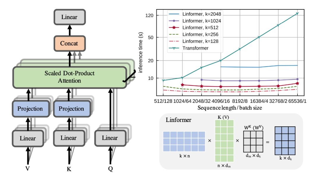 从 到 O(n)!首先作者从理论和经验上证明了自注意机制所形成的随机矩阵可以近似为低秩矩阵,所以直接多引入线性投影将原始的缩放点积关注分解为多个较小的关注,也就是说这些小关注组合是标准注意力的低秩因数分解。即如上图,在计算键 K 和值 V 时添加两个线性投影矩阵 E 和 F,即: