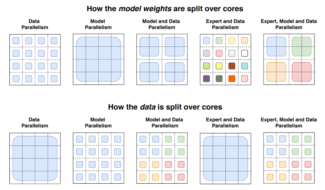 然后另一方面,其成功的原因是有一个很秀的并行策略,其同时结合了数据并行 + 模型并行 + expert 并行。具体如下图: