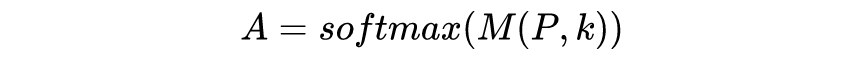 然后人工按内积分数过滤 top-k 个元素,即下式中的 M 操作,其他的 P 则直接置为负无穷,这样强制只让 k 个元素被关注。