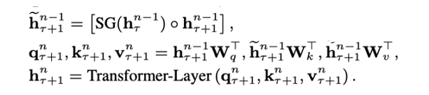 其中 SG 是是 stop-gradient,不再对 的隐向量做反向传播(这样虽然在计算中运用了前一个序列的计算结果,但是在反向传播中并不对其进行梯度的更新,毕竟前一个梯度肯定不受影响)。