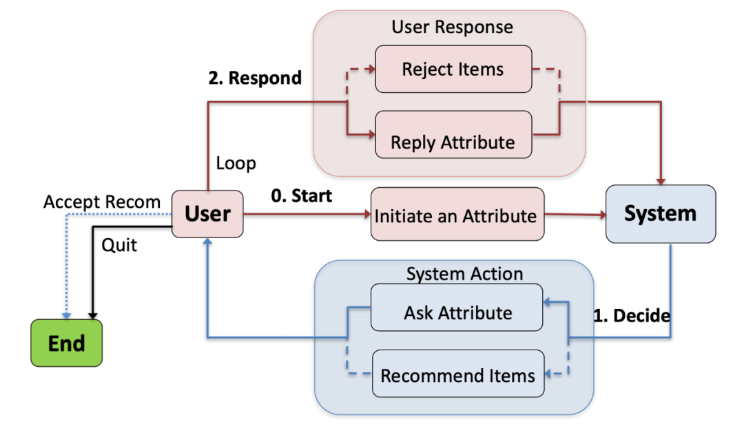 目前,CRSs 还没有主流、统一的定义。本文将 CRS 定义为:能通过实时的多轮对话,探出用户的动态喜好,并采取相应措施的推荐系统(“A recommendation system that can elicit the dynamic preferences of users and take actions based on their current needs through real-time multiturn interactions using natural language.”)。