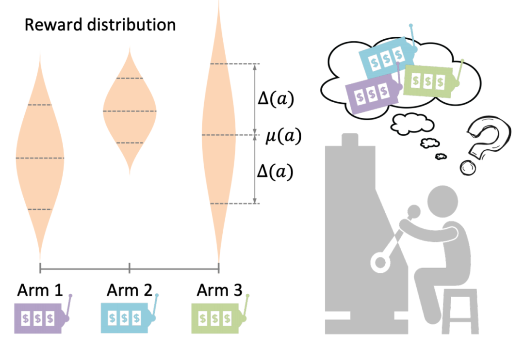 这就如同经典的多臂老虎机问题(Multi-armed Bandit, MAB),如图 4,一个赌徒可以选择多个老虎机的摇杆进行下拉。每个摇杆 下拉后的收益期望 μ 是可以根据多次实验估计出来的,但由于实验次数有限,对收益的估计存在不确定性 。若要追求全局最优点,便需要从尝试新摇杆(Exploration)与选择目前已知的高收益摇杆(Exploitation)这两者中不断交替权衡,从而达到长期的高收益。