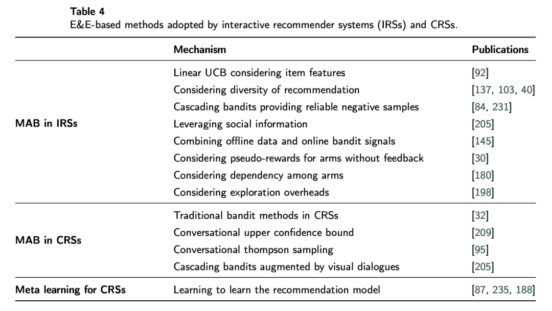 由于 CRSs 和交互式推荐系统一样,都可以实时地获得用户的反馈,于是 MAB 问题以及一系列解决方法都可以应用在 CRSs 与交互式推荐中。此外,除了经典的 MAB 算法,Meta learning 的方法也可以应用在 CRSs 中来解决冷启动或者 EE 问题。原文表 4 中列举了一些工作。