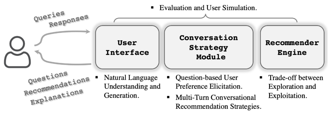 其架构可以用三个模块来组成,其中一个用户接口模块(User Interface)负责直接与用户进行交互;一个推荐引擎(Recommender Engine)负责推荐工作;还有一个最为核心的对话策略模块(Conversation Strategy Module)负责统筹整个系统的任务、决定交互的逻辑。本文总结了五个具有挑战的任务和研究方向,分别对应到这三个模块中。