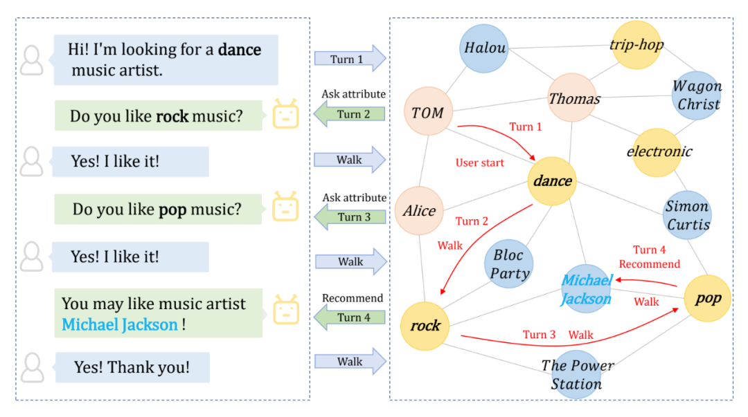 CRSs 的一项重要功能,是实时地向用户进行提问,以获得用户的动态偏好。这其中,各式方法可以分为两个类。一是询问商品,即收集用户对推荐商品本身的喜好;二是询问用户对商品属性的偏好,例如“你喜欢摇滚类的音乐吗?”一个基于路径推理的 CRS 示意图如下。原文表 1 总结了各种 CRSs 的工作原理。更多细节请看原文。