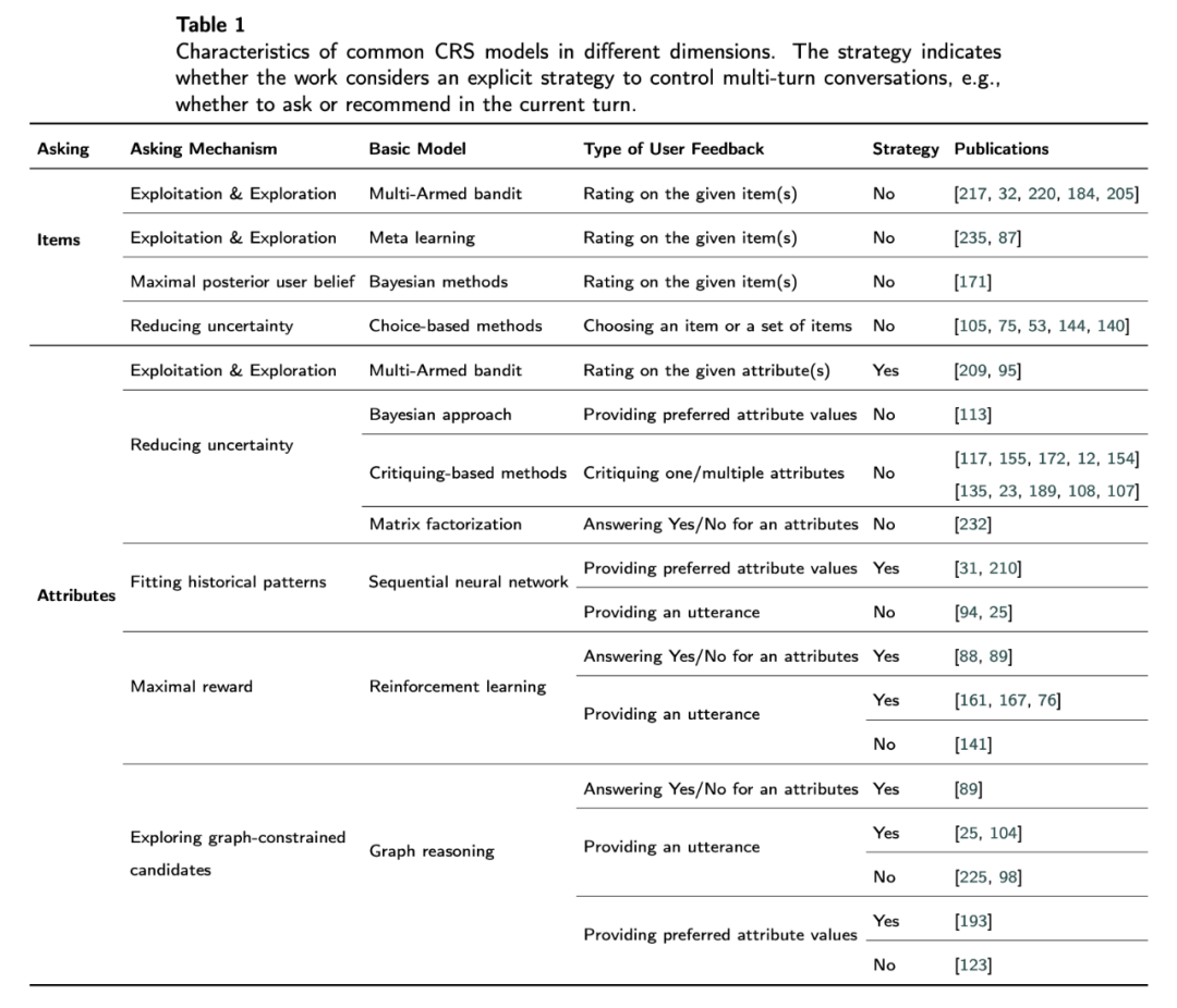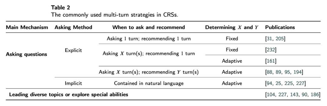 除了提问以外,CRSs 也可考虑其他多轮对话策略,如加入闲聊以增加趣味,或者加入说服,协商等多样化的功能以进一步引导对话。原文表 2 总结了 CRSs 的多轮对话策略。