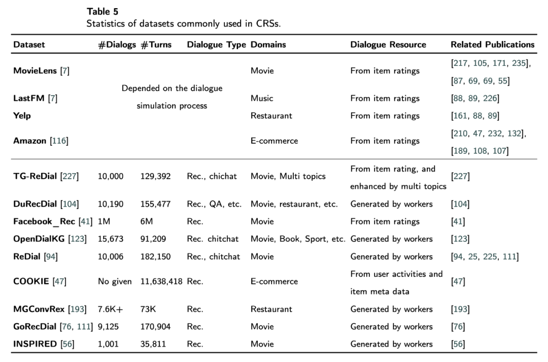 算法评测是个很重要的问题,在 CRSs 中,由于有些算法要求文本数据,有些算法要求实时交互数据,故有工作从众包平台采集实时交互的对话数据。而有些工作则另辟蹊径,从已有的推荐数据集中造出用户模拟器(User simulators)来与 CRS 模型进行实时的交互。原文表 5 列举了目前 CRSs 中常用的数据集。