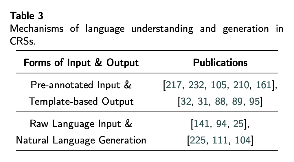 处理用户多样化的输入以及灵活的输出,也是 CRSs 中的一大挑战。目前的 CRSs 多数还是以基于提前标注的输入以及基于模版的输出为主,少数 CRSs 以对话系统的模式出发来考虑直接处理自然语言和生成自然语言。这是因为 CRSs 的主要目标还是保证推荐的质量,而非语言处理能力。原文表三总结了两个分类下的部分工作。