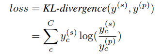 到这里可以发现模型预测的标签概率分布是一个向量,第二步得到的标签的模拟分布也是一个向量,为了让预测模型能够充分利用这些信息,本文在这里使用一个 KL 散度约束这两个向量表示要离得近一些,具体可以表示为如下形式: