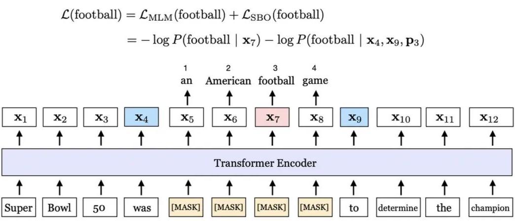 2. Span Boundary Objective(SBO):对于 span 内的每一个 token,除了原始的 MLM 的 loss,再加 SBO 的 loss,即: