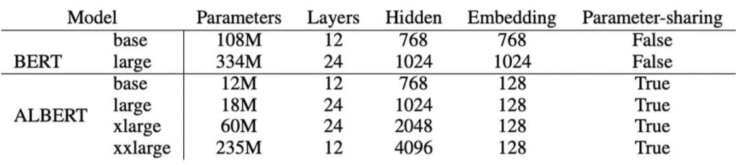 ALBERT 和 BERT 在不同配置下的参数量如下: