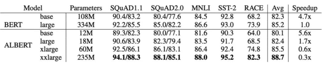 注意,这里的 Speedup 指的是训练时间而非推理时间,因为 ALBERT 的优化点主要在于降低参数量,这可以加速训练,但是模型层数并没有变化,所以推理时间不受影响。