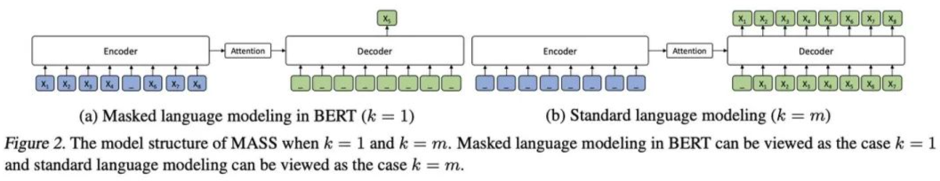 论文中提到,通过控制 Encoder 中 mask 的 token 长度 k,BERT 和 GPT 可看作是 MASS 的特例: